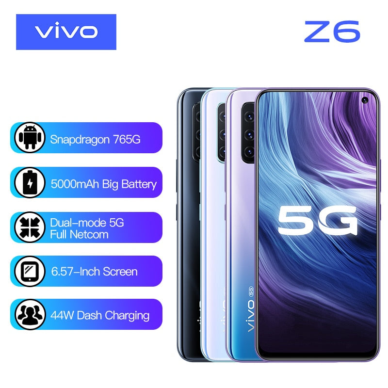 Authorized vivo Z6 5G Mobile Phone Snapdragon 765G 8G 128G Celular 6.57-inch screen 48.0MP 4 Cameras 44W Android10 Cell Phones